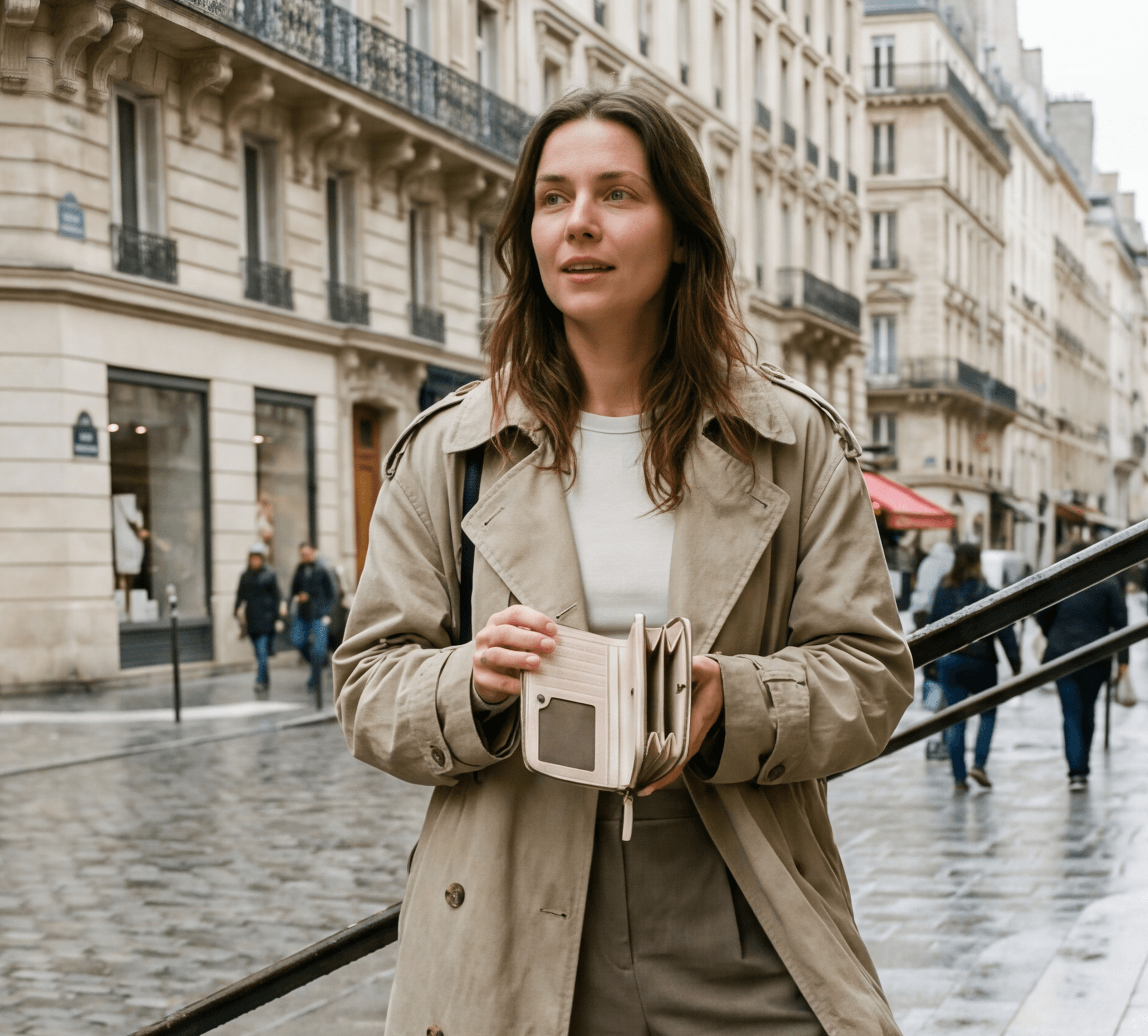 Binnenin vind je meerdere vakken voor pasjes, een transparant vak voor ID of rijbewijs en een handig ritsvak voor kleingeld. Aan de achterkant zit een extra ritsvakje voor kleine items.
